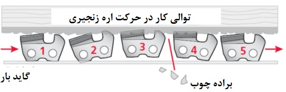 زنجیر: با گردش زنجیر به دور تیغه راهنما و برخورد آن با چوب، عمل برش انجام می شود. طول و گام زنجیر متناسب با نوع اره زنجیری و تیغه راهنما می باشد، همچنین انواع مختلف زنجیر موجود است که هرکدام مناسب انجام برش چوب های مختلف می باشند.