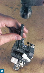 ب) پین لولایی را با استفاده از یک سوزن کوچک از داخل کاربراتور درآورید. مراقب باشید در حین این کار به کاربراتور آسیب نرسانید.