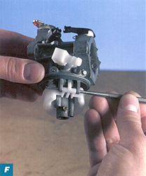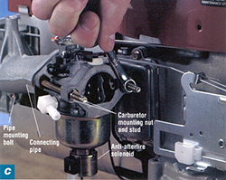 ج) برخی کاربراتورها دارای یک وسیله الکتریکی به منظور جلوگیری از خطرات ناشی از احتراق و جرقه زنی هستند. این سولنوئید الکتریکی را به وسیله قطع اتصال سیم آن از محافظ سولنوئید خارج سازید.