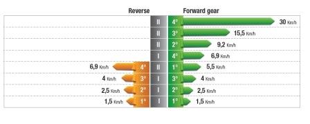 یکی از ویژگیهای سیستم انتقال قدرت این دستگاه، عمرمفید بالای آن میباشد که باعث شدهاست این دستگاه به اصطلاح عامیانه به یک دستگاه "عمری" تبدیل شود. بهصورتیکه حداقل میزان عملیات سرویس و نگهداری برای این دستگاه مورد نیاز است. سیستم جعبهدنده دو حالته (سبک و سنگین) این دستگاه 8 حالت دنده رو بهجلو و 4 حالت دنده عقب را به کاربر میدهد که حداکثر سرعت حاصله، مطابق نمودار زیر میباشد: