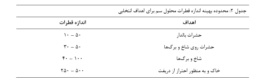 تعیین هدف در عملیات سمپاشی، تعیین کننده انتخاب هر یک از روشهای پخش محلول است. آفتکشها از نظر بیولوژیک مواد فعالی هستند و کاربرد موثر آنها میتواند این را ثابت کند که اگر به جای خیس کردن تمام سطح هدف از اندازه قطرات مناسب استفاده شود مقدار لازم سم را میتوان روی گیاه یا هدف مورد نظر جایگزین کرد. به طور کلی اندازه قطرات مناسب برای اهداف مختلف در جدول 2 ارائه شده است. در مصرف علفکشها برای جلوگیری از دریفت قطرات محلول، آنها را باید به صورت قطرات ریز (کوچک تر از 250 میکرون) به کار برد تا موثر واقع شوند.