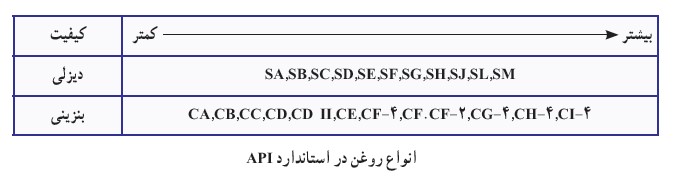 استاندارد [2]API: این استاندارد روغن های موتور را بر حسب تکنولوژی و کیفیت ساخت و... دسته بندی میکند. کد این استاندارد به صورت دو حرف می باشد که حرف اول بنزینی (C) یا دیزلی (S) بودن خودرو را مشخص می کند، حرف دوم کیفیت روغن را مشخص می کند. اگر روغنی برای هر دو موتور مورد استفاده قرار گیرد، کد اول برای موتور بنزینی و کد دوم برای موتور دیزلی است. مانند: API CE/SJ