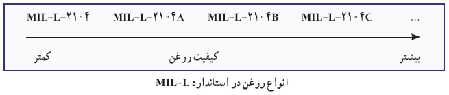 استاندارد MIL-L[3]: در این استاندارد کیفیت روغن موتور ب اعداد و حروف انگلیسی که در دنباله انداد آورده میشود مشخص میشود.