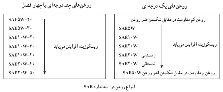 استاندارد SAE[1]: در این استاندارد طبقه بندی روغن موتور به وسیله اعداد بین 0 تا 60 مشخص میشود. روغن های تابستانی اعداد گرانروی (ویسکوزیته) در حد 30 تا 60 داشته (هر چه هوا گر متر باشد، باید از روغن با عدد بالاتر استفاده شود) و روغن موتورهای زمستانی، اعداد گرانروی بین 0 تا 25 دارند (هر چه هوا سردتر باشد، باید از روغن با عدد پایین تر استفاده شود). برای تشخیص راحت تر بعد از عدد گرانروی روغن های زمستانی حرف W درج می گردد و قبل از درج عدد گرانروی SAE نوشته می شود. مانند: SAE25W و SAE10W20