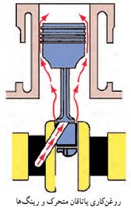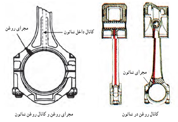 روغن از کانال اصلی به محورهای ثابت میل لنگ و از آنجا از طریق کانال هایی به محورهای متحرک (لنگ) میل لنگ منتقل میشود. روغن پس از روغن کاری محور لنگ و محور ثابت از کناره های آنها به کارتر می ریزد.