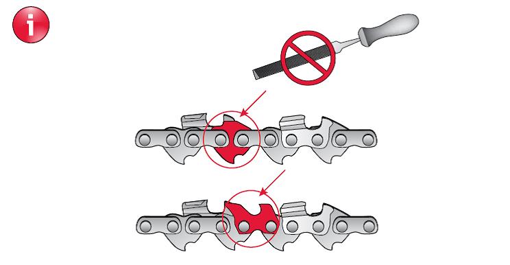 با انجام عملیات متعدد تیز کردن زنجیر، دندانه ها کوتاهتر شده وعمق برش از حالت قبلی کمتر می شود. در نتیجه باید به طرف دیگر زنجیر را تیز کنیم.