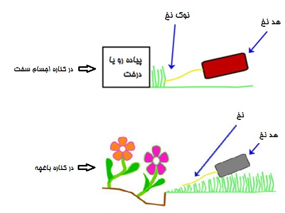 1- نخها میتوانند چمن و علفهای هرز مجاور دیوارها، نردهها، درختان و باغچهها را برش دهند، اما قدرت کافی برای آسیب زدن به تنه درختان، نهالها و نردهها را نیز دارند. برای اجتناب از این آسیبها طول نخ را بین 10 تا 13 سانتیمتر تنظیم کنید و دستگاه علفتراش را در حالت گاز کامل استفاده نکنید.