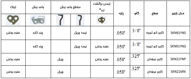 زنجیرهای منتخب از نظر مشخصات فنی گام، پایه و سایز مناسب برای ارههای زنجیریNT230، SKN3200، NT180، SKN5200 و SKN5800 هستند.