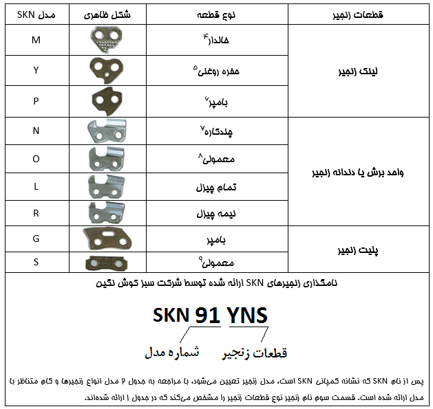 به منظور تشخیص نوع زنجیر باید ظاهر و کارایی اجزای زنجیر را به خوبی بشناسید. در جدول 1 انواع قطعات و نام آنها برای آشنایی با سیستم نامگذاری زنجیر اره SKN ارائه شده است.