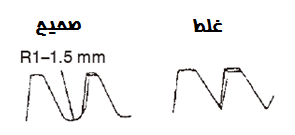 استفاده از تیغه تیز: هر زمان که تیغه کند شد یا باید تیز شود یا باید تعویض شود. تیز کردن باید با ابزار و به روش صحیح انجام شود. برای مثال در تصویر توجه کنید، شعاع انحنای لازم مابین دو دندانه تیغه نشان داده شده است، تیز کردن تیغه نباید به صورتی باشد که این انحنا از بین رود. اگر در تیز کردن تیغه مهارت ندارید از تیز کردن آن صرف نظر کنید و تیغه را تعویض نمایید. تیز کردن دستی تیغه منجر به ایجاد دندانههای برش غیر متعادل خواهد شد و در نتیجه لرزش در زمان کار بالا میرود که خرابی سریعتر دستگاه را به دنبال خواهد داشت.