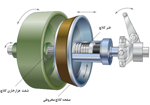 اصطکاکی: اساس عملکرد این کلاچها درگیري دو صفحه داراي ضریب اصطکاك بالا است که این درگیـري