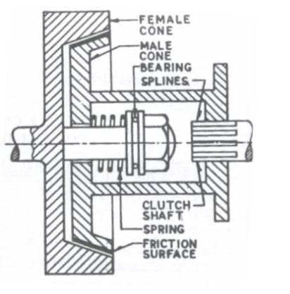 در این کلاچها همانگونه که از اسم آن پیداست سطوح اصطکاکی به شکل مخروطـی هـستند. هنگـامی کـه کـلاچ درگیر می شود، گشتاور از طریق فلایویل که سطح داخلی آن به شکل مخروطی است به صفحه کلاچ که سطح مخروطی دارد، منتقل می شود. براي خلاص کردن کـلاچ نیـز سـطح مخـروط صفحه کلاچ کمـی از درون فلایویل بیرون کشیده می شود تا تماس دو سطح قطع شود.