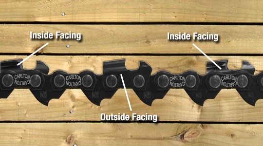 3-زنجیر را بچرخانید و دانههای برنده را بررسی کنید تا بتوانید کوتاهترین واحد برنده را پیدا کنید. کوتاهترین واحد برنده، تعیین کننده مقدار براده برداری با سوهان خواهد بود، چرا که در پایان عملیات تیز کردن زنجیر، تمام دندانههای واحدهای برنده زنجیر باید هماندازه باشند.