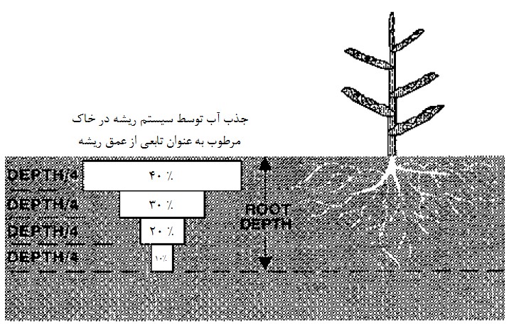تحت شرایط محیطی یکسان، گیاهی با سطح برگ کمتر و سیستم ریشه کوچک تر از نیاز آبی کمتری نسبت به گیاهی با سطح برگ بیشتر و سیستم ریشه متراکم برخوردار خواهد بود. عمق ریشه دوانی بالقوه (Potential Root Depth) پایینترین عمقی است که ریشه گیاه قادر به رسیدن به آن نقطه در خاک باشد. این عمق به نوع گیاه بستگی داشته ولی مستقل از نوع خاک و شرایط آن است. حداکثر عمق ریشه دوانی (Maximum Root Depth) پایینترین عمقی که ریشه گیاه تحت شرایط خاص خاک از جمله موانع فیزیکی و شیمیایی قابلیت دستیابی به آن را دارد که اغلب کمتر از عمق ریشه دوانی بالقوه است. عمق ریشه دوانی موثر (Effective Root Depth) قسمت فوقانی عمق ریشه که گیاه بیشترین جذب آب را از آن قسمت انجام میدهد. عمق ریشه موثر به طور تقریبی نصف حداکثر عمق ریشه دوانی در نظر گرفته میشود. با توجه به عمق و توسعه ریشه گیاه حدود 70 درصد از آب مصرفی خود را از 50 درصد فوقانی عمق توسعه ریشه جذب میکند.