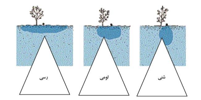 قدرت نفوذ آب، جهت جریان، نیاز آبی و کارایی مصرف آب در زمینهای مختلف متفاوت است. میزان و نوع نفوذ آب در زمین به نوع و جنس خاک وابسته است. در زمینهایی با بافت خاک شنی، نفوذ آب در خاک به صورت عمودی است. در اراضی رسی سخت، آب به آرامی وارد خاک میشود اما در جهت افقی سریع حرکت میکند. شدت نفوذ در خاکها از چنین ترتیبی پیروی میکند: رسی > سیلتی > شنی. شدت نفوذ و نشت در خاکهای شنی بسیار بیشتر از خاکهای سیلتی و رسی است. بنابراین، نیاز آبیاری در طول فصل رشد گیاه در خاکهای شنی بیشتر از خاکهای رسی است.