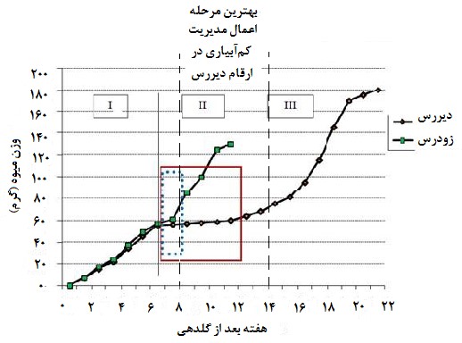 شکل 6 منحنی رشد میوه هلو در ارقام زودرس و ارقام دیررس