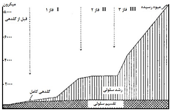 درختان میوه هستهدار دارای سه مرحله رشد هستند. مرحله اول که مرحله تقسیم سلولی است. در این مرحله رشد میوه سریع میباشد. مرحله دوم که مرحله سخت شدن هسته است رشد میوه کند میشود. مرحله سوم که مرحله افزایش حجم میوه بوده و مرحله بزرگ و آبدار شدن آن می باشد (شکل 1). این درختان در مراحل رشد سریع میوه (مرحله اول و مرحله سوم) به تنش آبی بسیار حساس میباشند و در این مرحله نیاز به آبیاری کامل دارند. رشد میوه در مرحله اول حاصل تقسیم سلولی سریع و طویل شدن سلولی با سرعتی کمتر از تقسیم شدن سلول است. رشد میوه در مرحله سوم در اثر طویل شدن سلولهای موجود است. مرحله دوم رشد میوه کند است و میوه برای جذب مواد غذایی با شاخهها و برگها رقابت نمیکند. در این زمان شاخهها به سرعت رشد میکنند و گسترش تاج به حداکثر خود میرسد. مرحله دوم رشد میوه فرصتی را فراهم میکند تا بتوان قدرت رشد درخت را با آبیاری محدود بدون آسیب به رشد میوه کاهش داد. این کار فایده دیگری نیز دارد و کمآبیاری، تاج درخت را کوچک تر میکند و تاج کوچک تر منجر به افزایش نفوذ نور شده و جوانههای میوهده برای سال بعد افزایش مییابد. بنابراین در درختان میوه هستهدار با توجه به زمان رسیدن میوه، کم آبیاری در دو مرحله شامل مرحله دوم رشد میوه (مرحله سخت شدن هسته) و نیز در دوره پس از برداشت انجام میشود. در دوره رشد سریع میوه (مرحله اول) و مرحله بزرگ و آبدار شدن آن (مرحله سوم رشد میوه) که دوره بحرانی به تنش آبیاری است باید آبیاری به طور کامل و براساس نیاز آبی انجام شود.