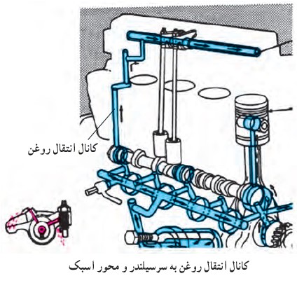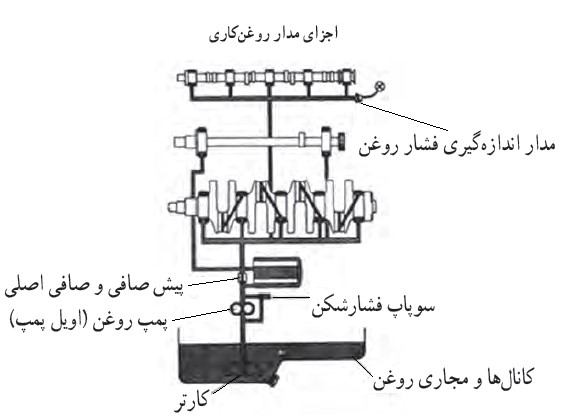 مدار روغنکاری موتور با توجه به قطعاتی که نیازمند روغنکاری هستند در چند مسیر منشعب میشود که عبارت اند از: