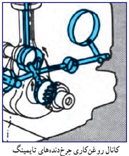 چرخ دنده های زمان بندی از طریق ریزش روغن از لوله ای، که از مدار اصلی تغذیه می شود روغنکاری می شوند. در بعضی از موتورها در اثر پاشش روغن توسط چرخ دنده سر میل لنگ روغنکاری می شوند.