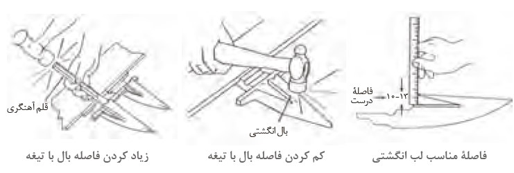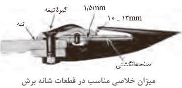 الف) در صورتی که سر گیره خمیده باشد، برای کم کردن فاصله بین گیره با تیغه با استفاده از ضربات چکش فاصله را از بین ببرید و در صورتی که فشار گیره روی تیغه زیاد است، به وسیله دیلم کوچکی جلوی گیره را بلند کنید و یا چند ضربه چکش به عقب گیره وارد کنید. در صورتی که با روش های بالا تنظیم صورت نگرفت، گیره را تعویض کنید.