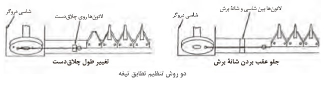 در بعضی از دروگرها با کم یا زیاد کردن واشرهای چلاق دست و یا واشرهای بین شاسی و شانه برش میتوان تنظیم تطابق را انجام داد.